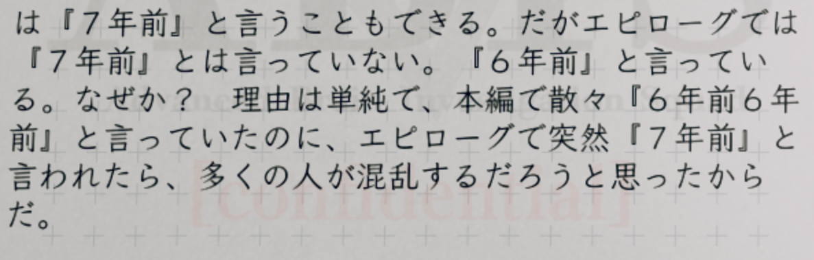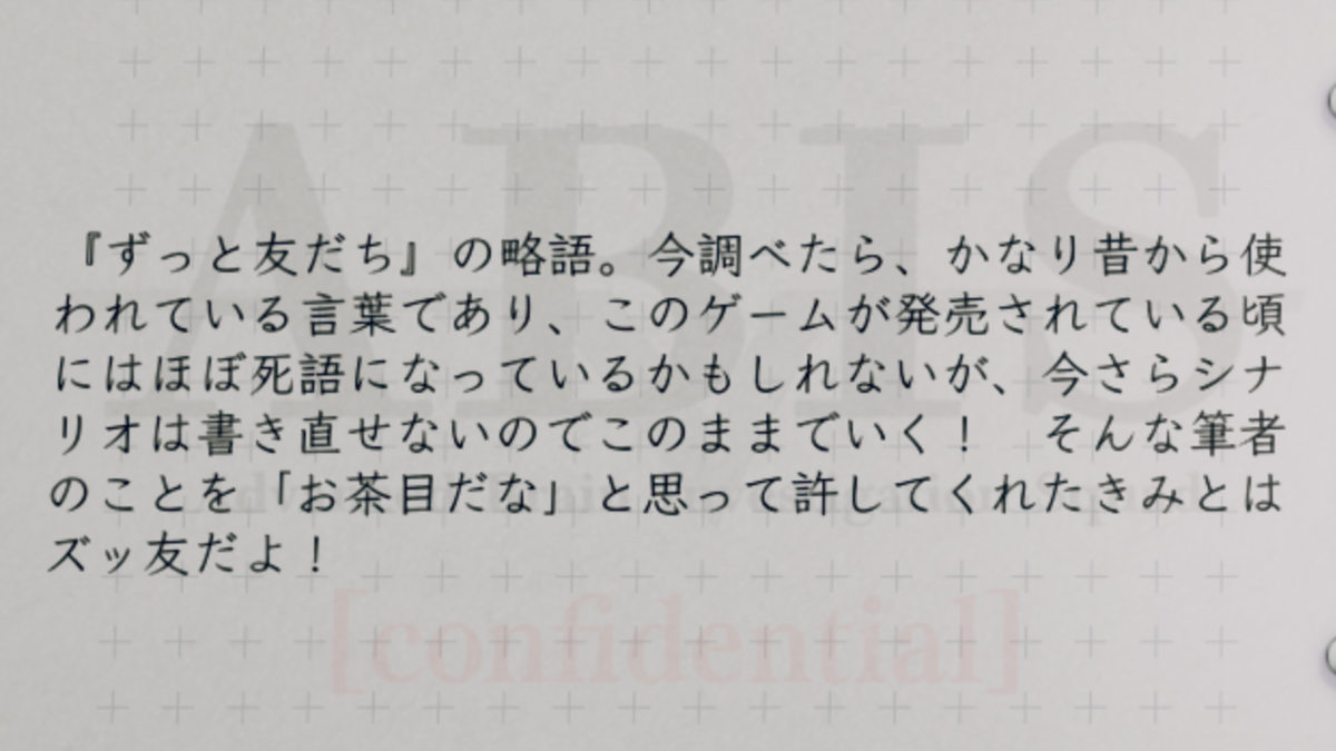 このゲームの作者は生真面目である。おそらく載っている用語については、ちゃんと調べた上で、正確に書くことを当たり前のこととして実践している。そして、その上で、「ズッ友」が死語になってしまっているかもしれないことをわざわざ言い訳している。この言葉だけではなく、いわゆる「中二病」についても、何回かゲーム内で言及され、「逆にそれがむしろ中二病ではないか?」というようなヒネったツッコミもしている。作者は自らが、そして自らの作品がどのように見られるか、そして見られる時に「わたしはその見方について気が付いていますよ!」ということを言わずにはいられない。これは、ある意味で、生真面目なその作風とも通じている部分なのだろう。またエピローグ近くになって解放されるTipsとして「〇〇寄生時の〇〇の謎」(〇〇はネタバレ防止のため伏せる)や「エピローグの時期」があるが、これはシナリオ上の穴を埋めるような解説文である。ここでは、プレイヤーのほとんどが気が付かないような穴(やや不合理な点)をわざわざ説明している。以下の画像は「エピローグの時期」というTipsの説明文の切り抜きである。作品中に出てくる年数への想定されるツッコミについて説明している。