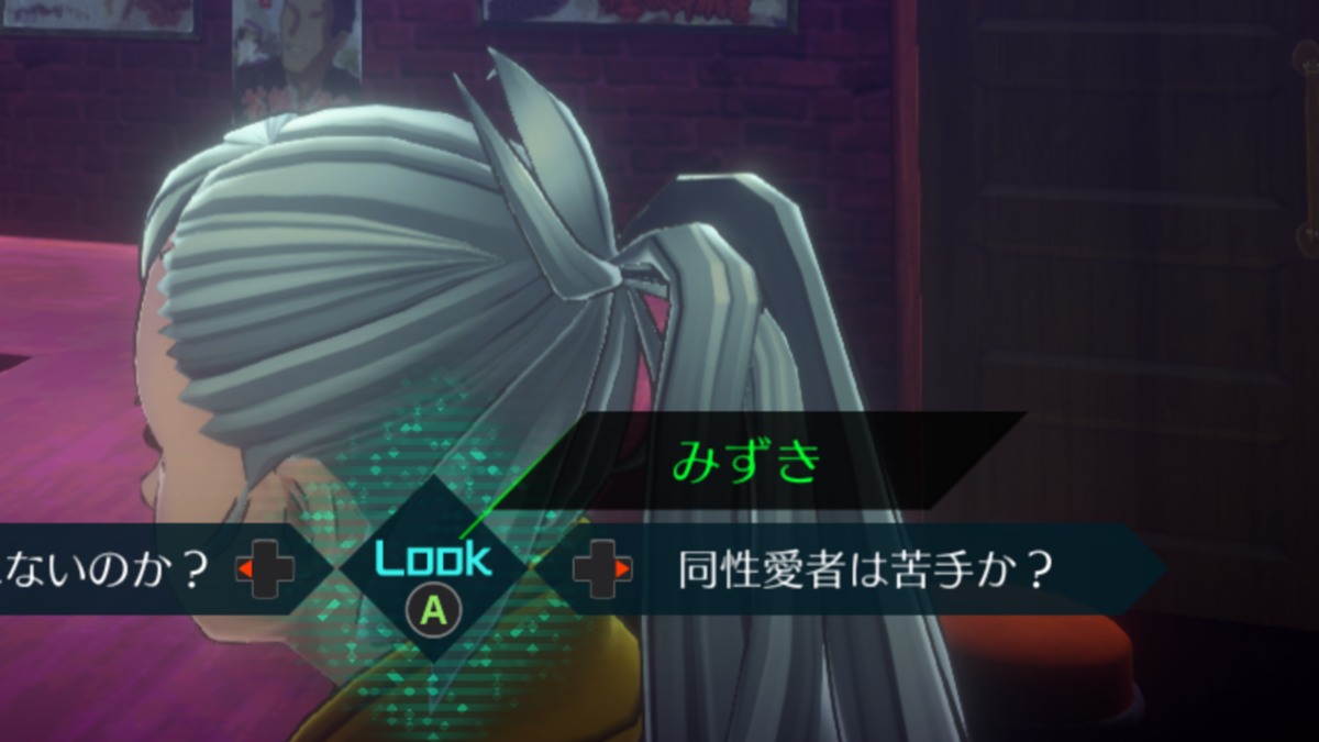 例えば、私が気になるのは、むしろ次のような場面に現れている。ある捜査の流れの中で、主人公の伊達は、小学生を新宿2丁目のゲイバーに連れていき「同性愛者は苦手か?」と問わせる選択肢をプレイヤーに提示する。